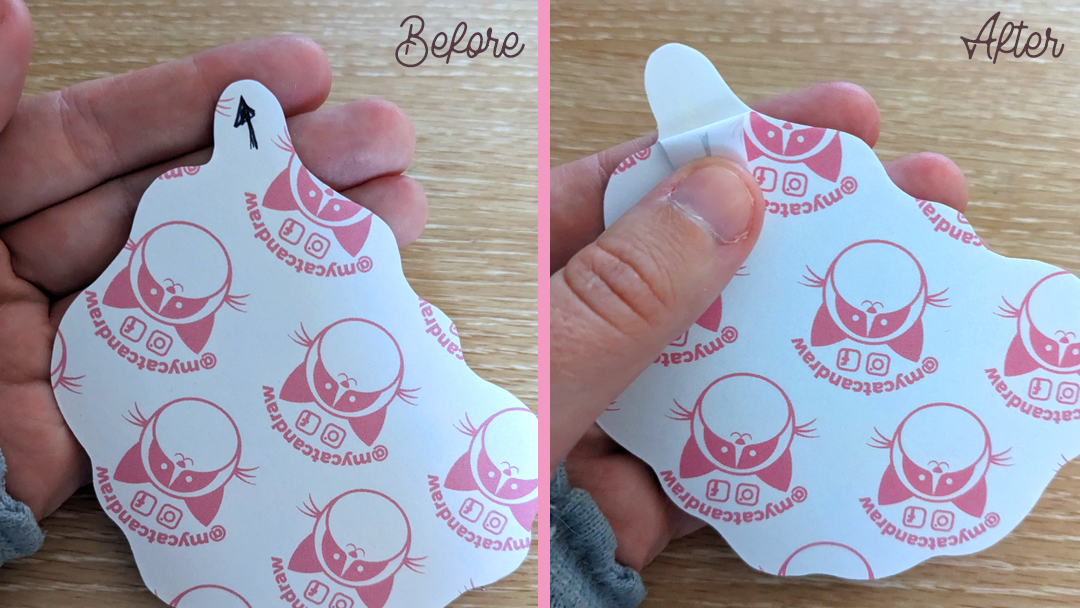 I have pre-lifted every sticker I make and drawn an arrow on the back showing where you can peel the sticker easily. In order to peel my stickers, have the front side of the sticker face away from you and peel back on the paper where the arrow is pointing for easier peeling. See example image below.